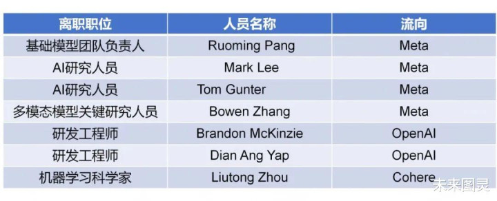 战略上的摇摆和产品进展的迟缓,动摇了团队信心,也使得苹果的AI人才成为竞争对手重点追逐的对象。自2024年6月底以来,苹果人工智能团队遭遇了大规模的核心人员流失。